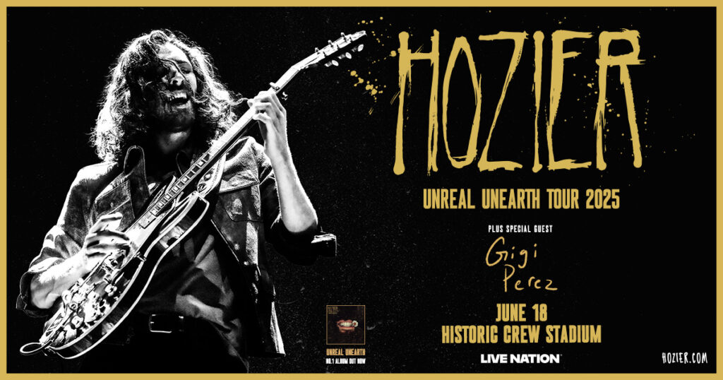 Irish musician and singer, Hozier, will be stopping at Historic Crew Stadium on Wednesday, June 18, 202 on his national Unreal Unearth 2025 Tour with special guest, Gigi Perez! Known for his beautiful voice and hits like Take Me to Church, From Eden, and Movement, Hozier will deliver a memorable performance that blends indie rock, blues, and folk with his signature depth and passion.